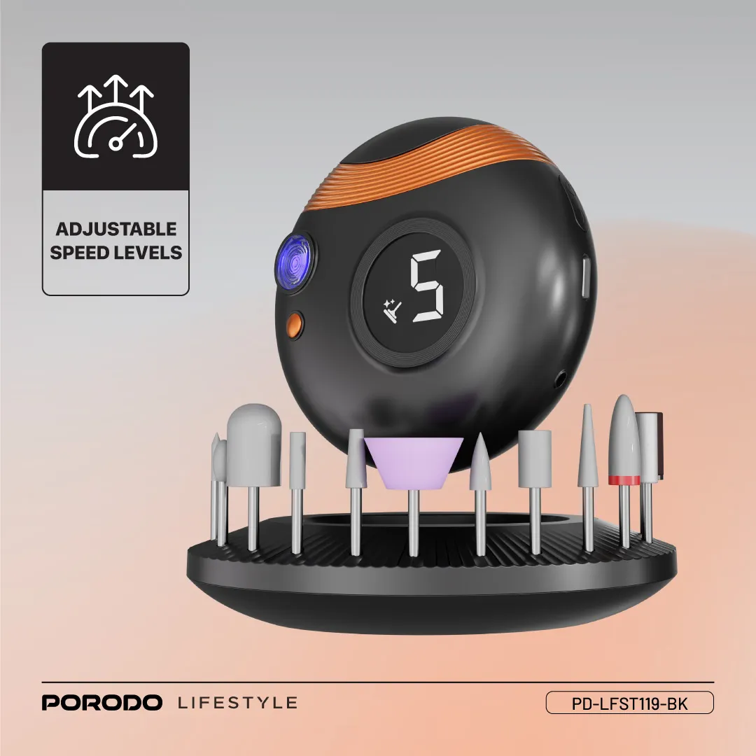 جهاز عملي للعناية بالأظافر في المنزل بسهولة واحترافية. يأتي مع رؤوس متعددة لتقليم وتنعيم وتلميع الأظافر، مع تصميم مدمج وشحن Type-C لسهولة الاستخدام في أي وقت.