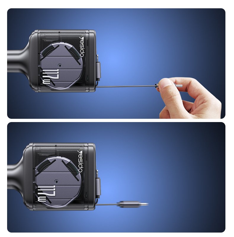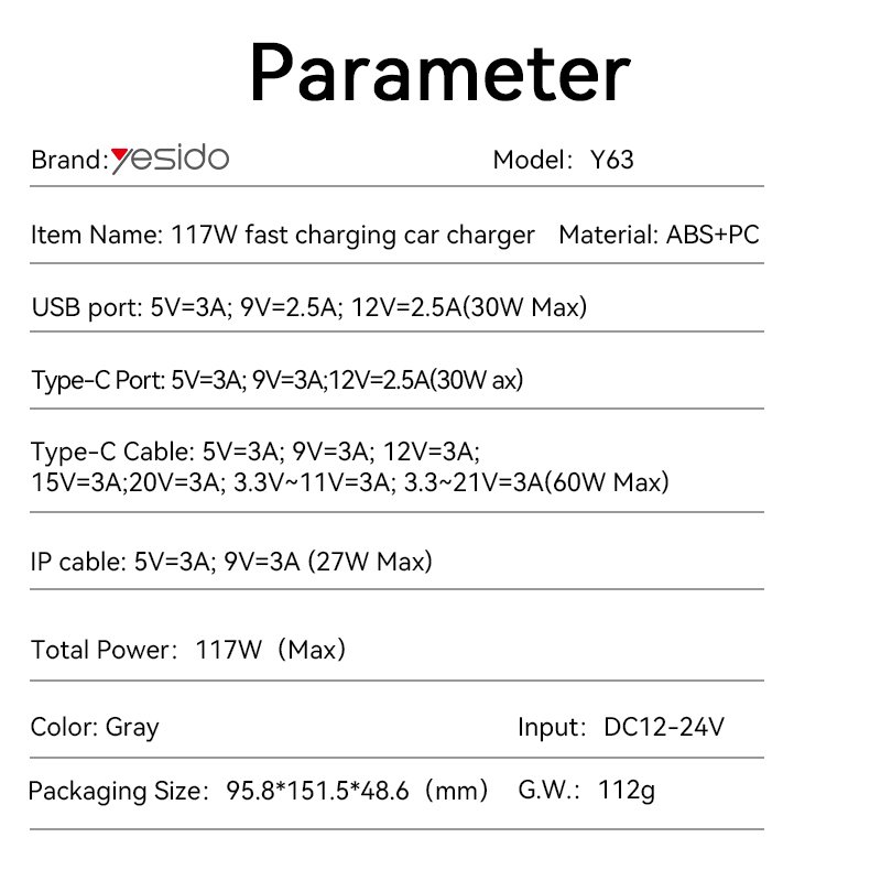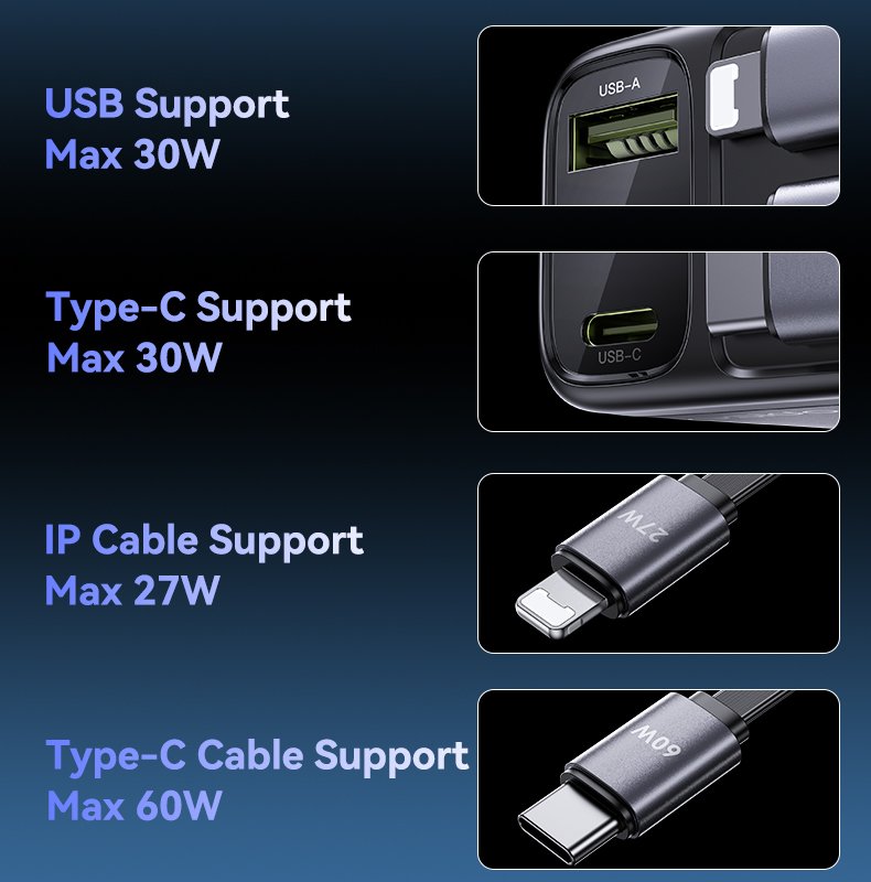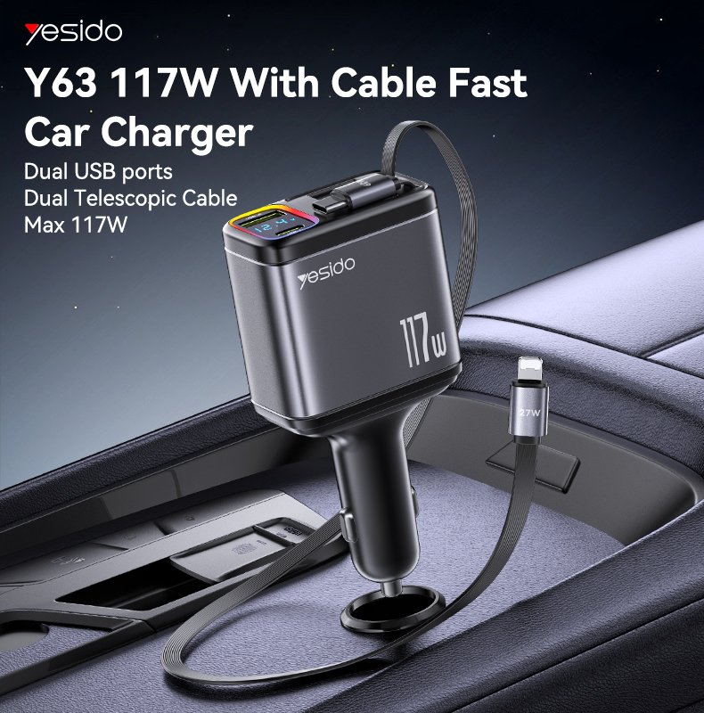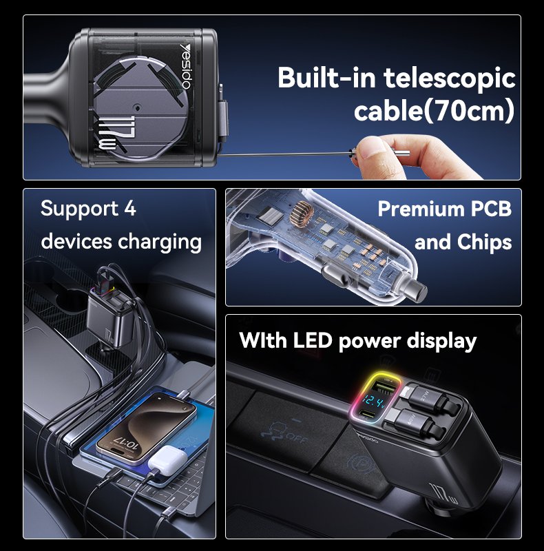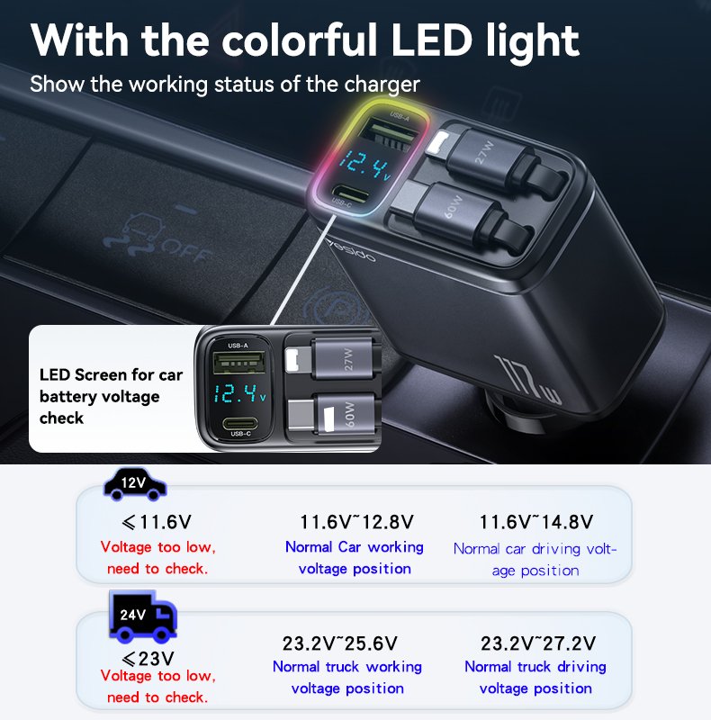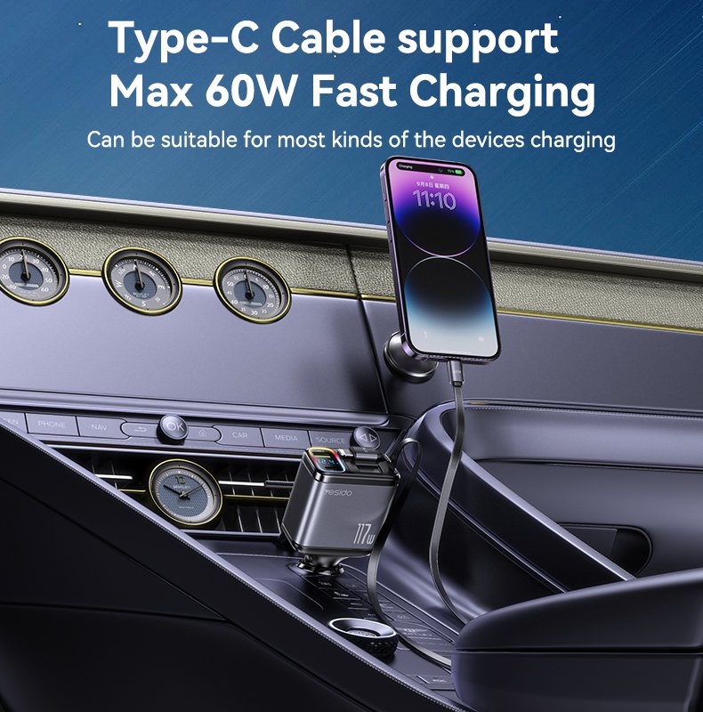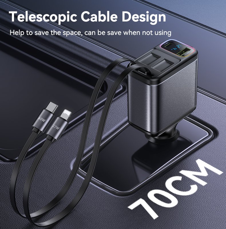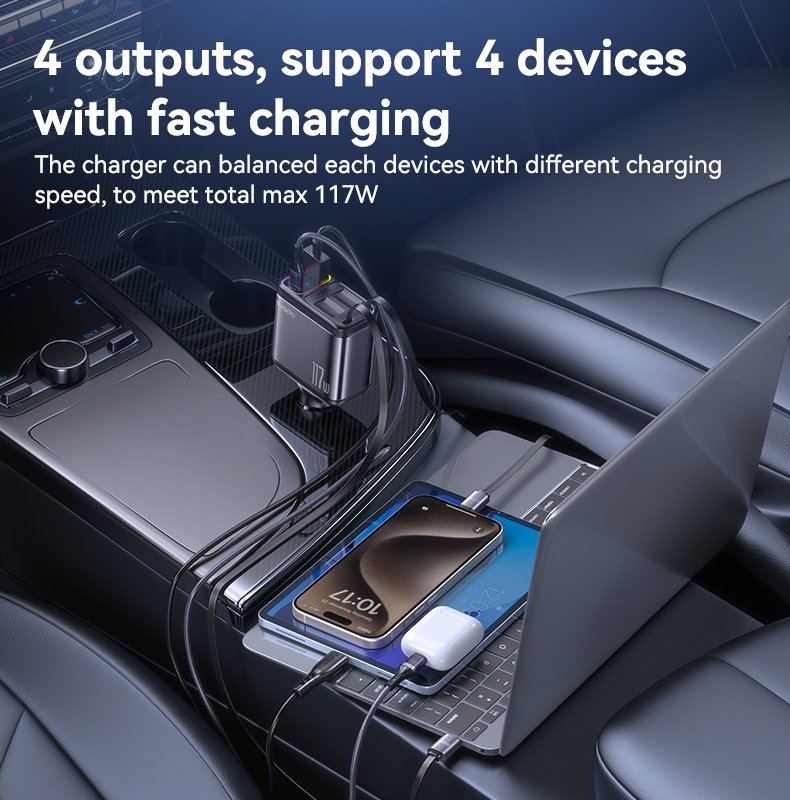 شاحن سيارة بقوة 117 واط، يتيح شحن أربعة أجهزة في نفس الوقت عبر كيبلين مدمجين قابلين للسحب (Type-C + Lightning) مع منفذ USB ومنفذ Type-C إضافيين. مزود بشاشة LED لعرض الطاقة والفولتية، وتصميم أنيق وعملي للاستخدام اليومي والرحلات.