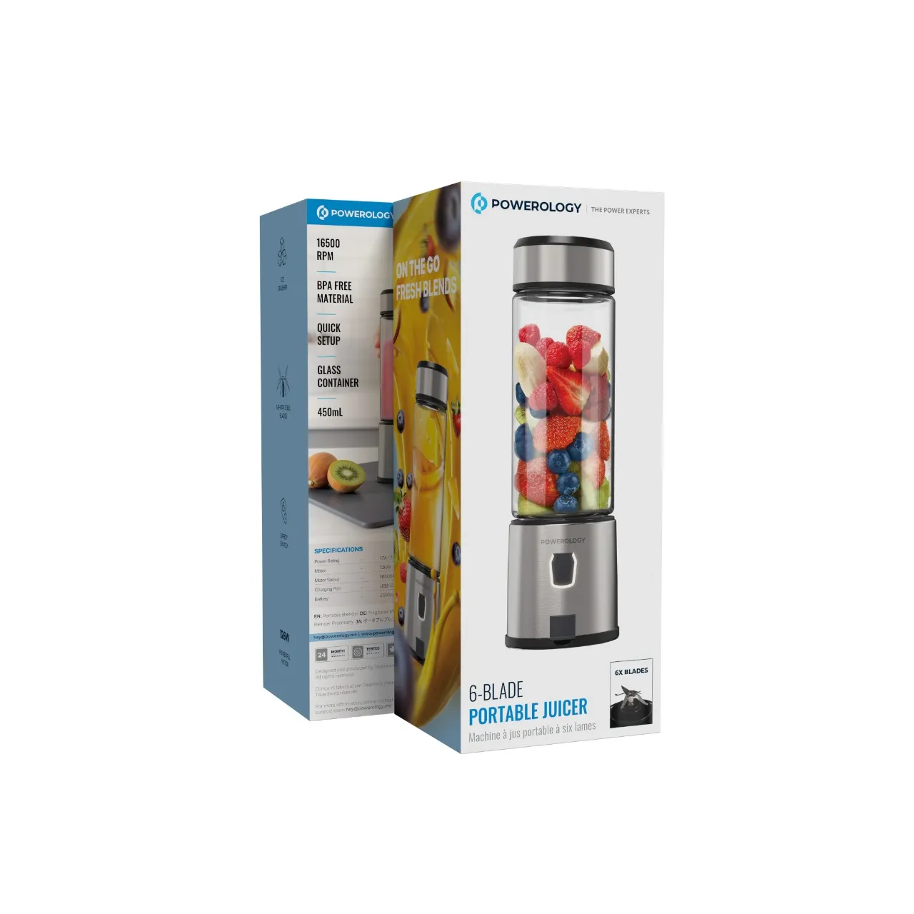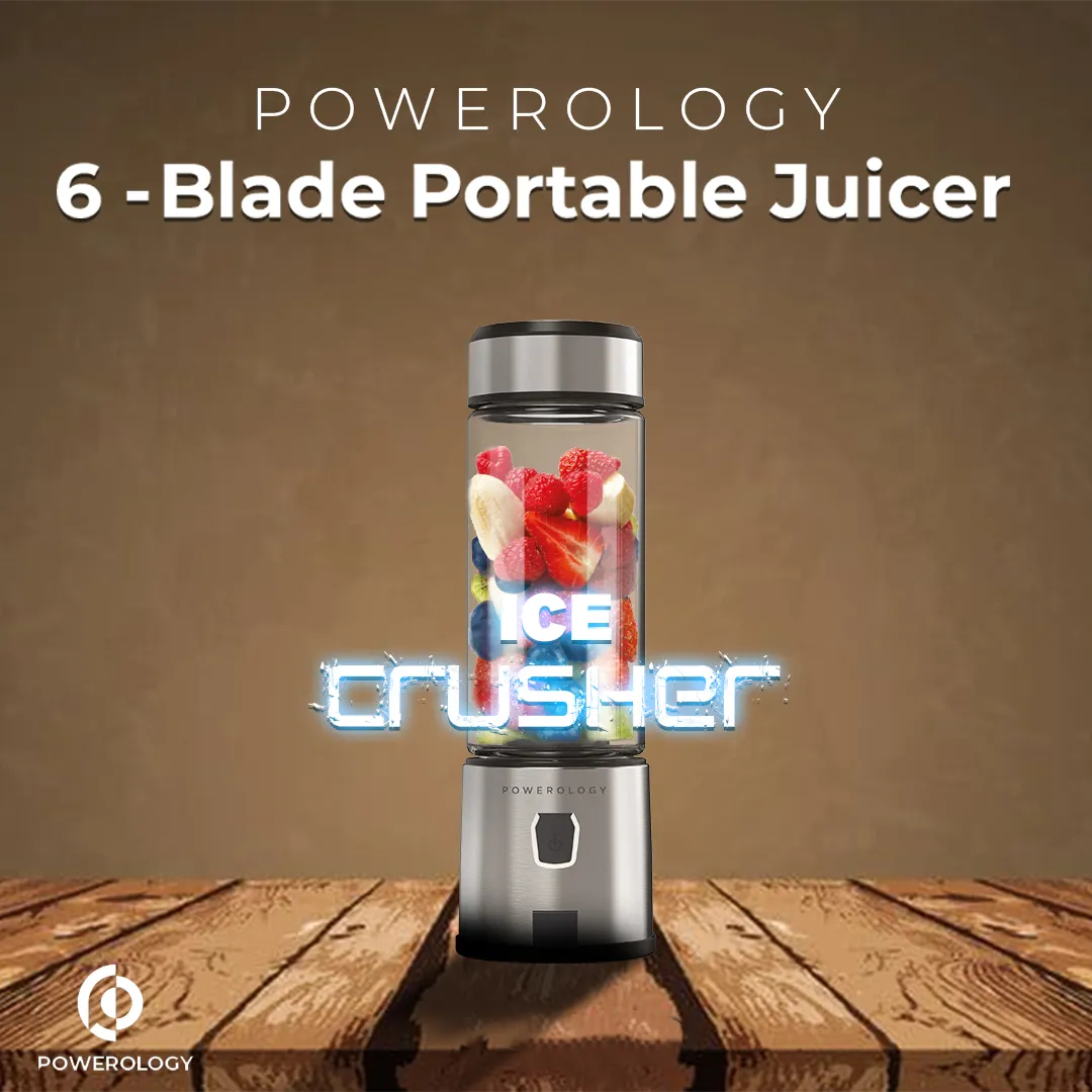 استمتع بتحضير عصائرك الطازجة بسهولة في أي وقت مع عصارة Powerology المحمولة بتصميم أنيق ولون فضي عصري. أداء قوي وسريع يمنحك خلطًا متجانسًا، مع هيكل زجاجي عملي مناسب للاستخدام اليومي في المنزل أو النادي أو أثناء السفر