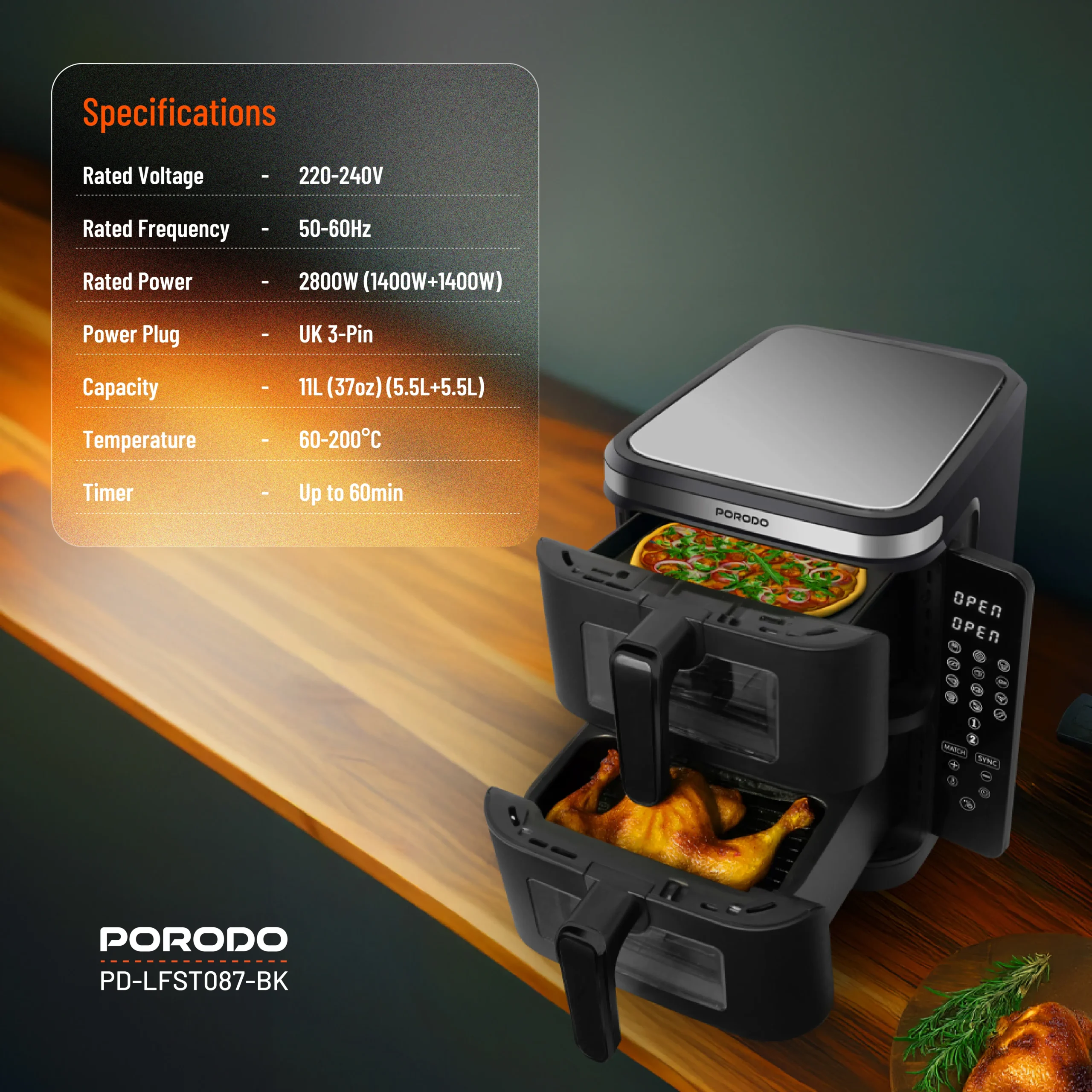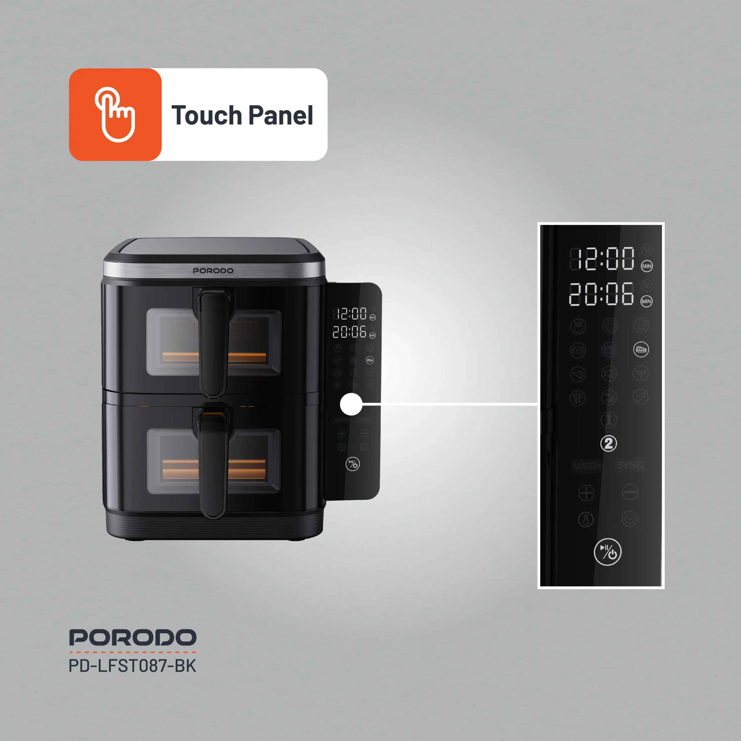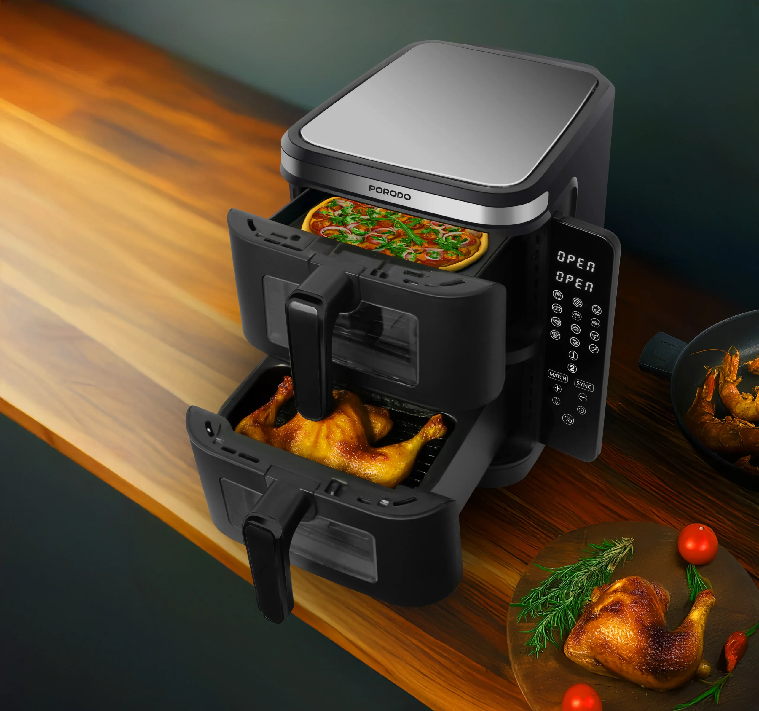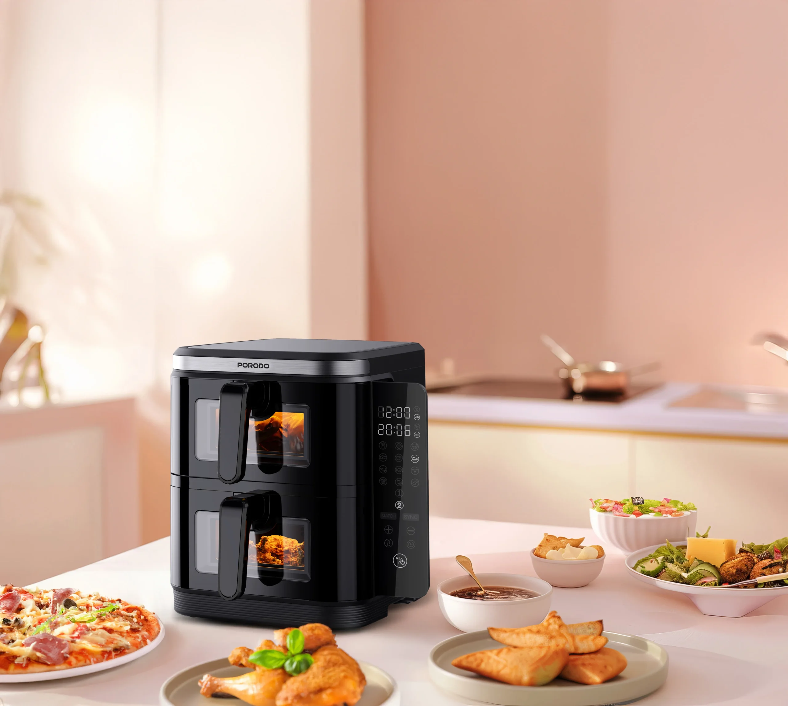 استمتع بطهي صحي وسريع مع قلاية هوائية مزدوجة من بورودو. تصميم مزدوج مبتكر يتيح لك طهي وجبتين في نفس الوقت لتوفير الوقت. استمتع بطبخ صحي بدون زيت مع شاشة لمس ووظائف طهي متعددة لتجربة مطبخ متطورة وسهلة الاستخدام.
