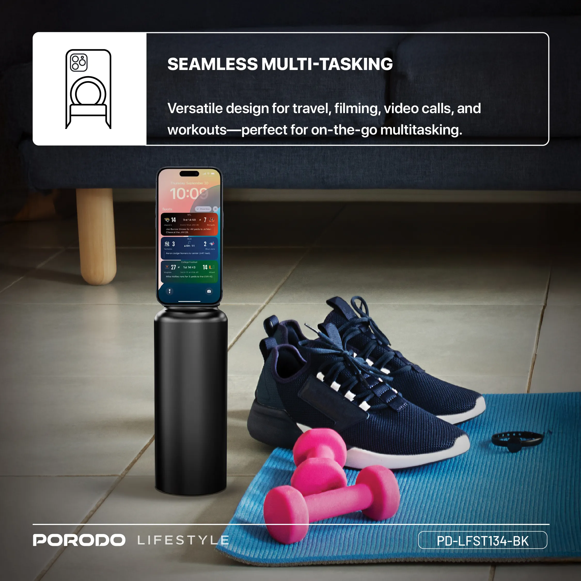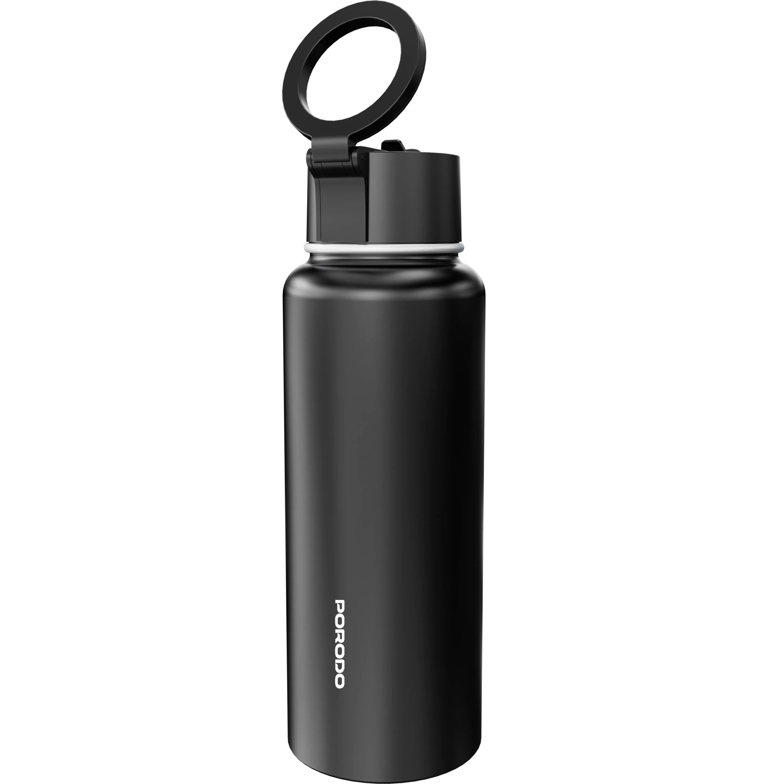مطارة حرارية بسعة 1 لتر من Porodo، مصنوعة من ستانلس ستيل عالي الجودة، تحافظ على المشروبات باردة حتى 24 ساعة وساخنة حتى 12 ساعة.تصميم عملي للتنقل والرياضة، ويمكن استخدامها أيضًا كـ ستاند للجوال